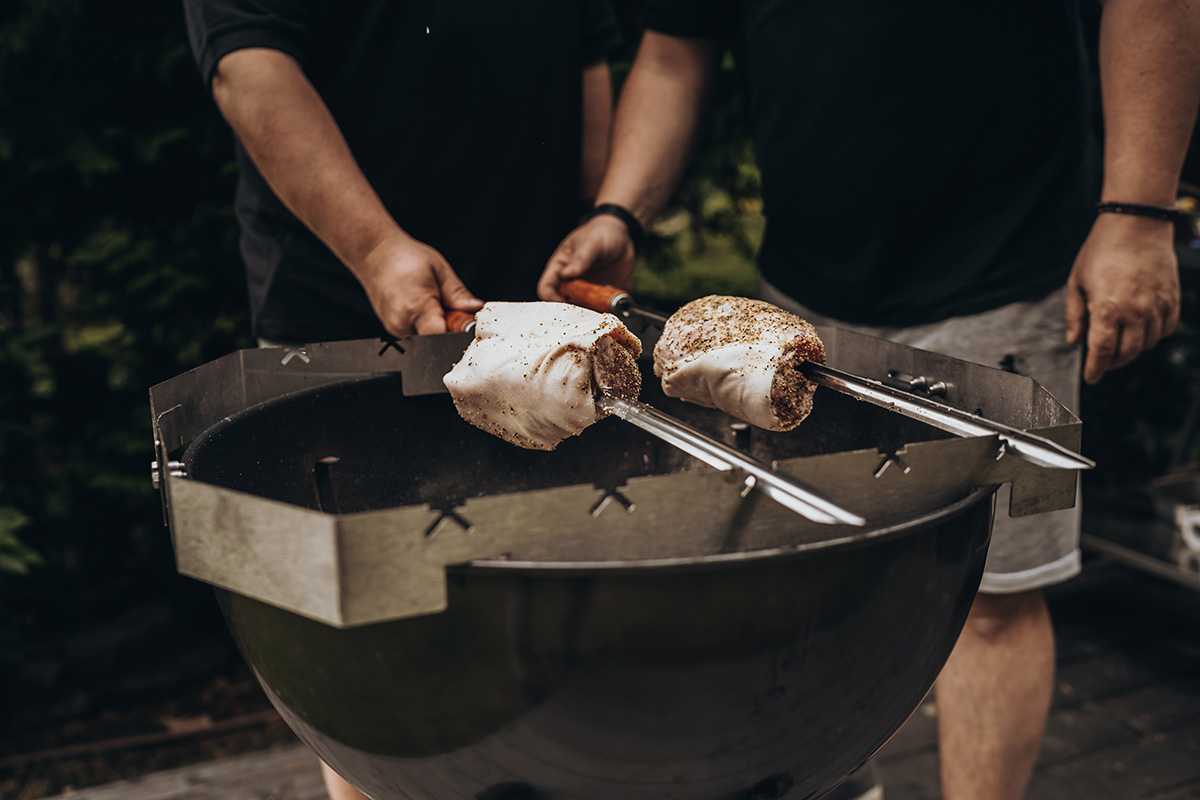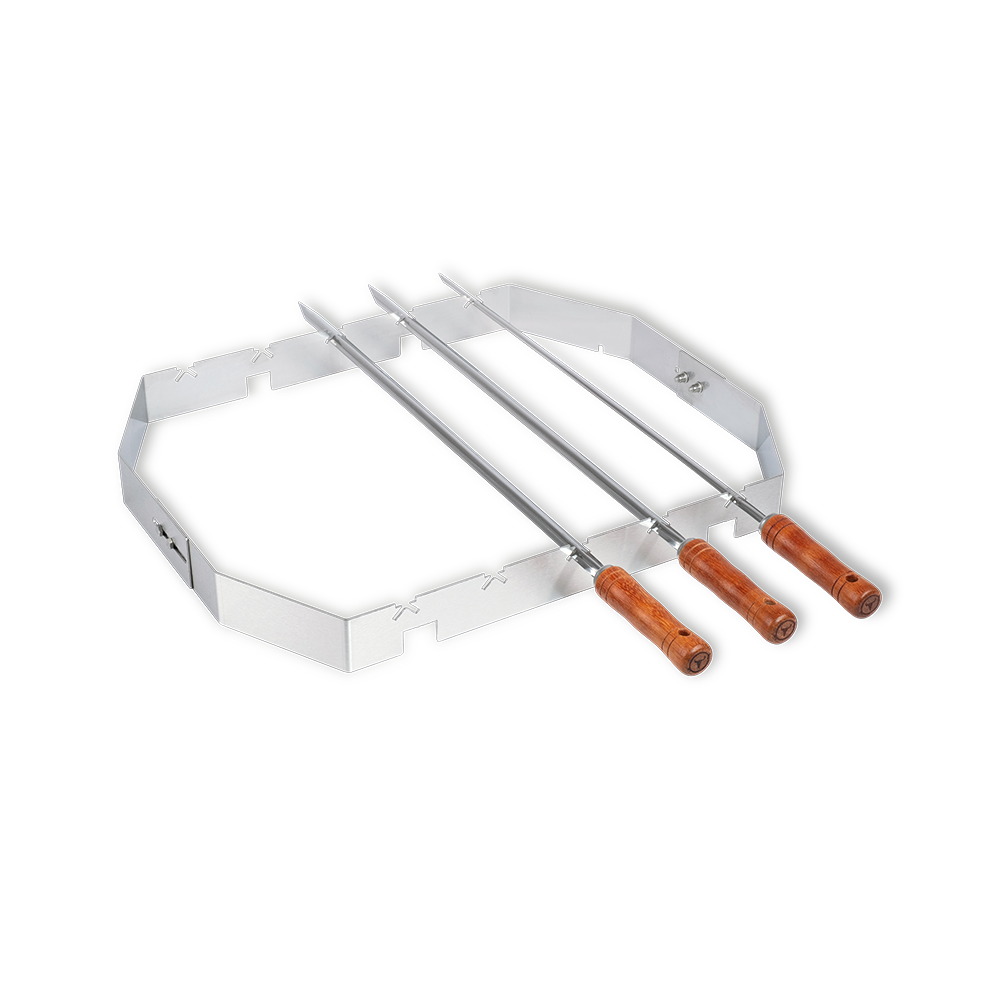 Der Churrasco Aufsatz wird auf dem PizzaRing für deinen Kugelgrill platziert oder direkt auf dem Kugelgrill. Die im Set enthaltenen brasilianischen Spieße können in den vorgegeben Auskerbungen fixiert werden.