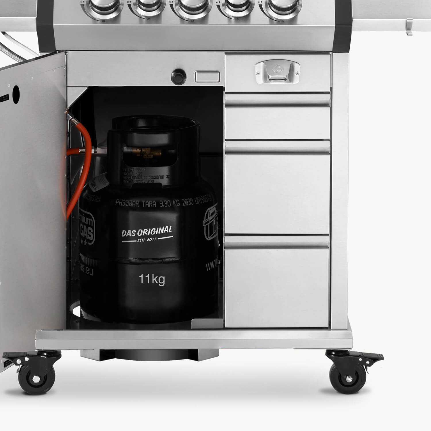 - Platz für eine 5 kg, 8 kg oder 11 kg Gasflasche