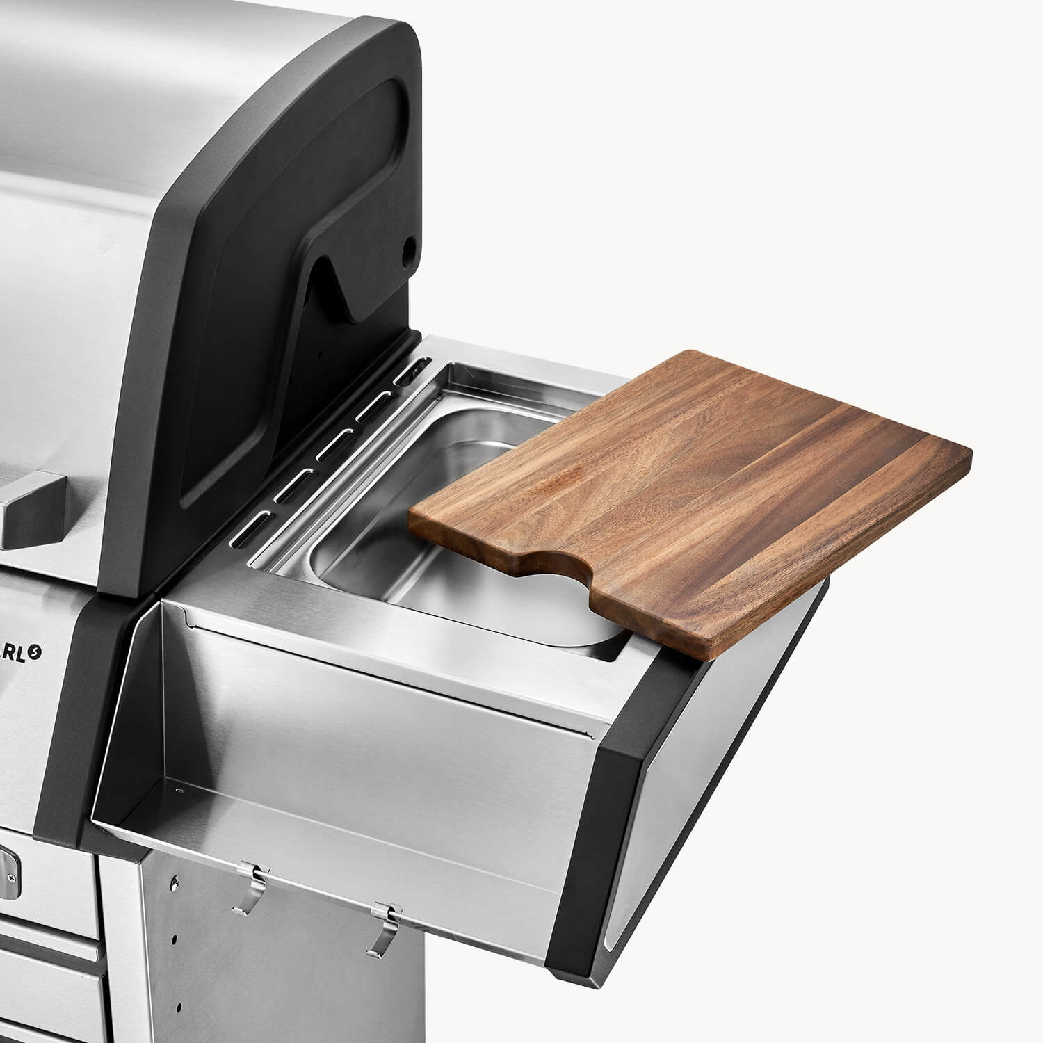 und ein solides Schneidebrett aus Akazienholz im Seitentisch.