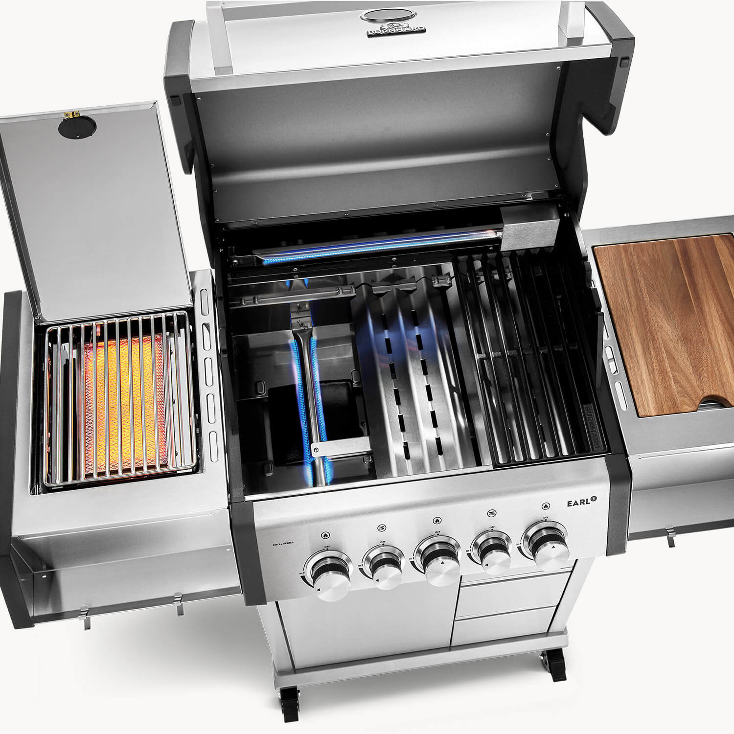 EARL, unser 3-Brenner Gasgrill mit Heckbrenner, kommt mit fettem Backburner und Infrarot-Keramikbrenner,