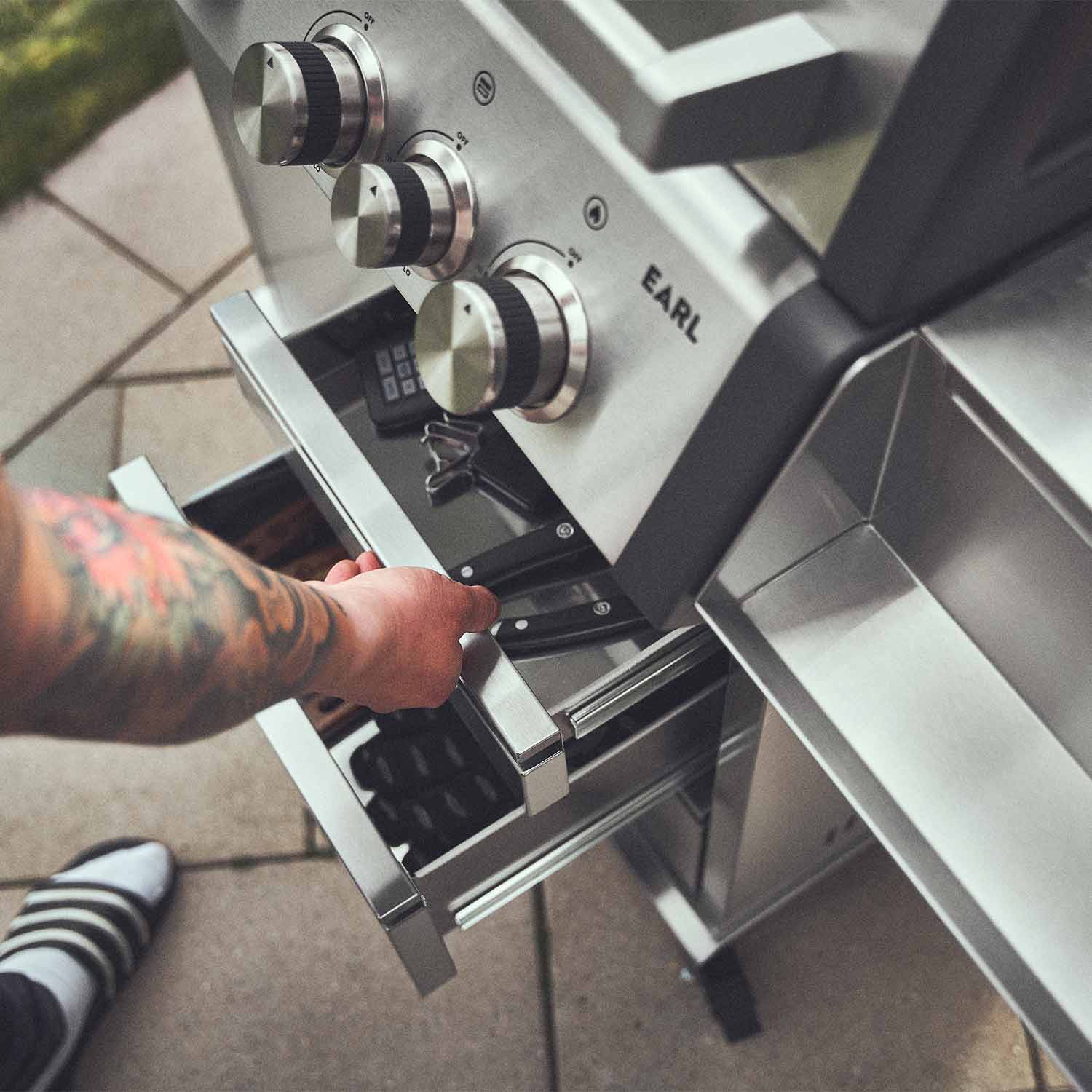 Dein Gasgrill mit Heckbrenner hat nicht nur ordentlich Power unter der Haube, sondern auch sagenhaft viel Platz für alles, was du für deine BBQ-Eskalation sonst noch so brauchst. Verstaue Grillzubehör in einer der 3 Schubladen oder an den individuell fixierbaren Zubehörhaken. Deine Streitmacht an Grillsaucen und Rubs haste dank der integrierten Ablagefläche im Seitentisch natürlich auch immer griffbereit. Und die Gasflasche?