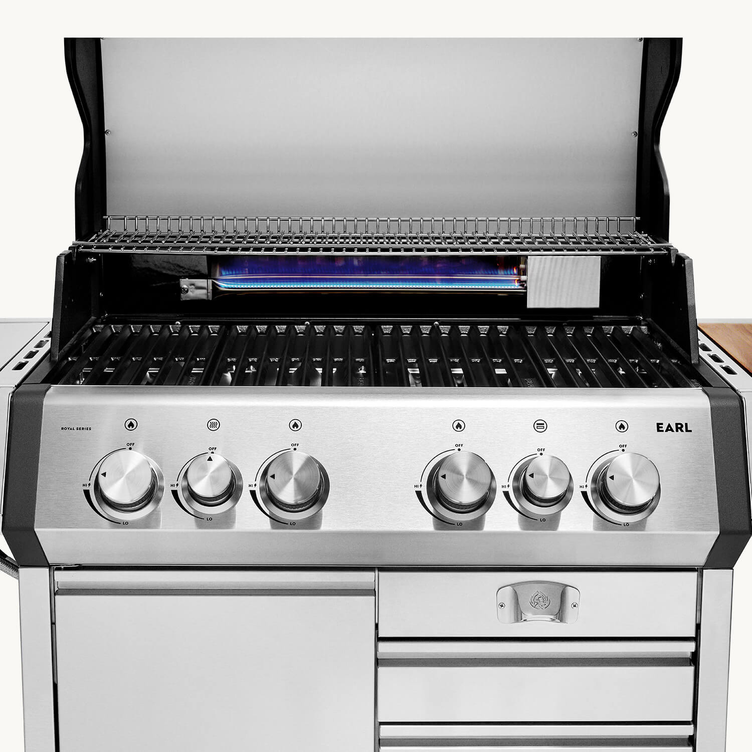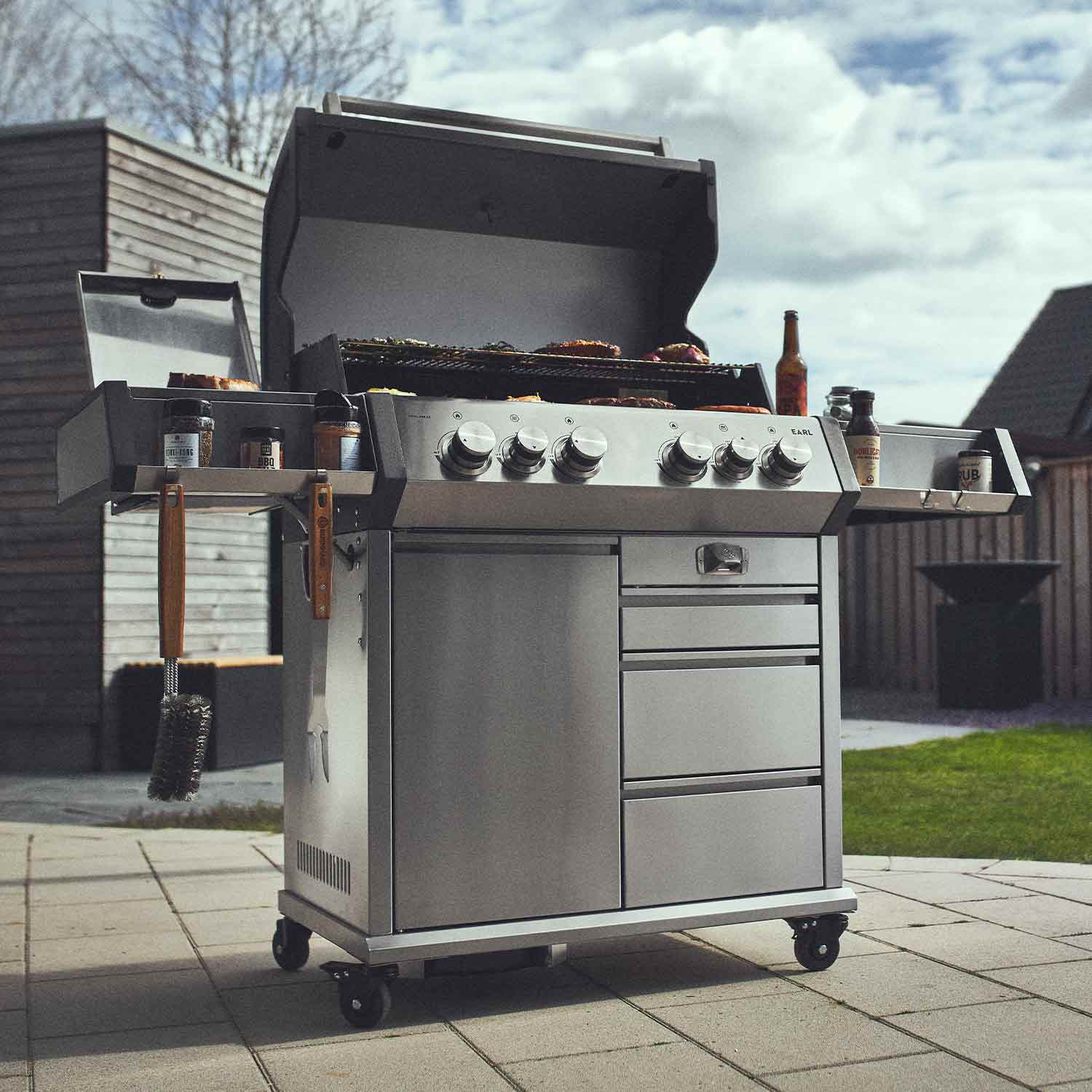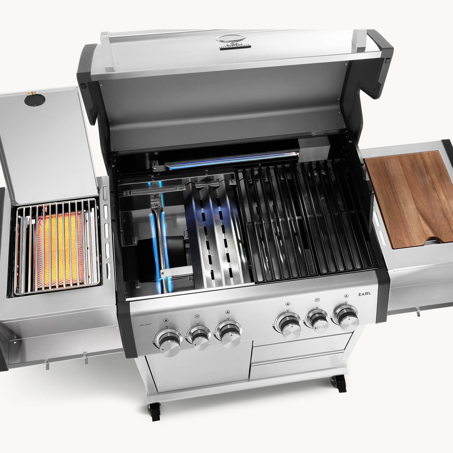 EARL, unser 4-Brenner Gasgrill mit Heckbrenner, kommt mit fettem Backburner und Infrarot-Keramikbrenner, um deinem nächsten Grillgelage die Krone aufzusetzen!
