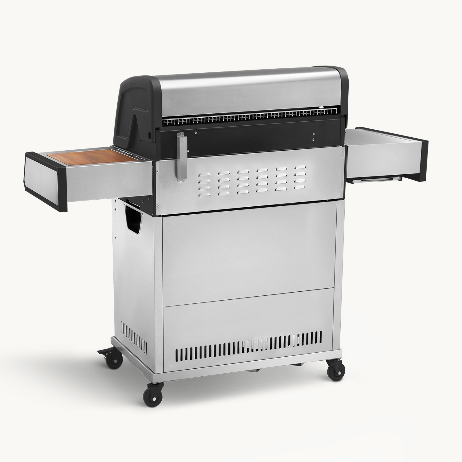 Abklappbare Seitentische, GN-Food Container, Akarzienholz-Schneidebrett, Abdeckhaube und ordentlich Stauraum für all dein Zubehör machen deinen neuen Premium Gasgrill jetzt schon zur Legende.