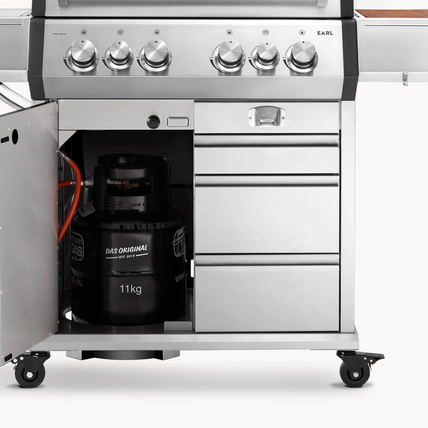 - Platz für eine 5 kg, 8 kg oder 11 kg Gasflasche