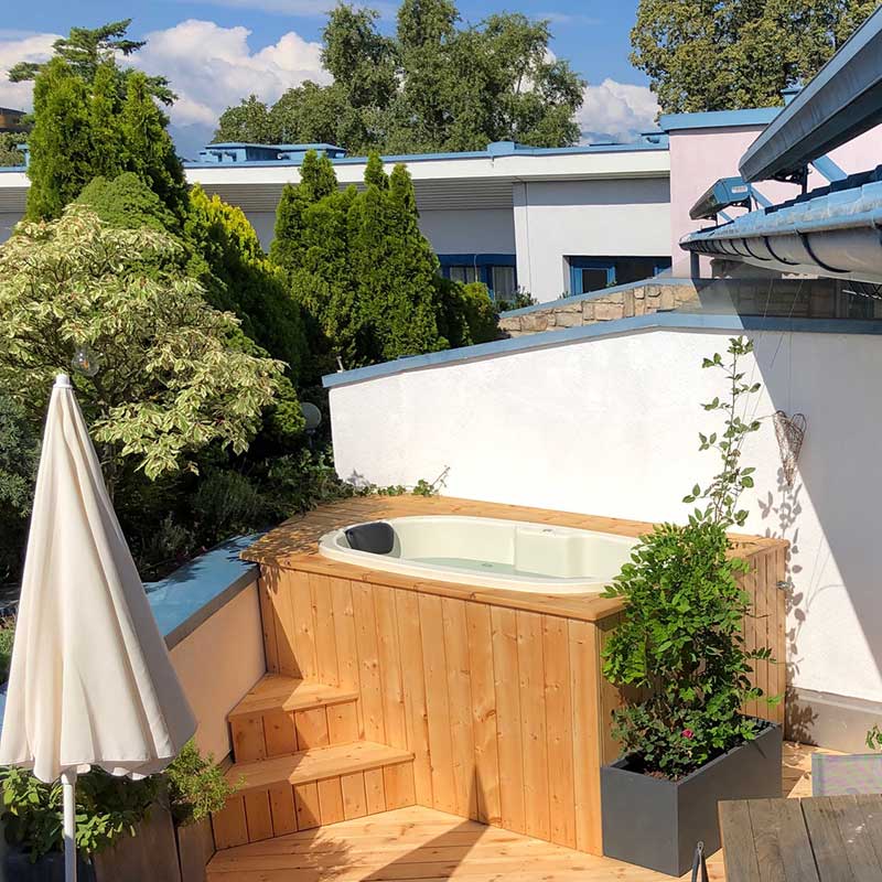 Unser kleinstes jedoch innovatives Modell, bietet Ihnen Platz für zwei Personen. Badespaß auf kleinstem Raum. Die GFK Wanne hat eine Tiefe von 96 cm, ein Fassungsvermögen von 800 Litern und benötigt eine minimale Stellfläche. Durch die relativ geringe Wasserfüllung ist dieser Zuber sehr sparsam und eine schnelle Aufheizphase ist ihnen sicher. Auf Komfort brauchen Sie jedoch nicht verzichten da auch unser "Kleiner" mit angenehmen Sitzflächen und zwei gepolsterten Kopfstützen ausgestattet ist.