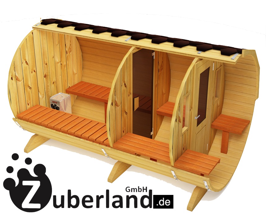 Die Fass-Sauna ist für 4-6 Personen geeignet. Sie verfügt über einen Vorraum und eine kleine überdachte Sitzmöglichkeit im Außenbereich für 2 Personen. Dieses Modell ist sehr komfortabel. Im Vorraum haben Sie sowohl die Möglichkeit, sich auch bei kalten und nassen Witterungsbedingungen umzukleiden, als auch gemütlich zu entspannen. Der kleine überdachte Außenbereich lädt ein, sich draußen in freier Natur zu entspannen. Die Fass-Sauna kann mit einem Holzofen oder mit einem Elektroofen ausgestattet werden. Die Sauna kann ohne Fundament aufgestellt werden und ist in der Regel ein baugenehmigungsfreies Vorhaben, welches aber im Einzelfall zu prüfen ist.