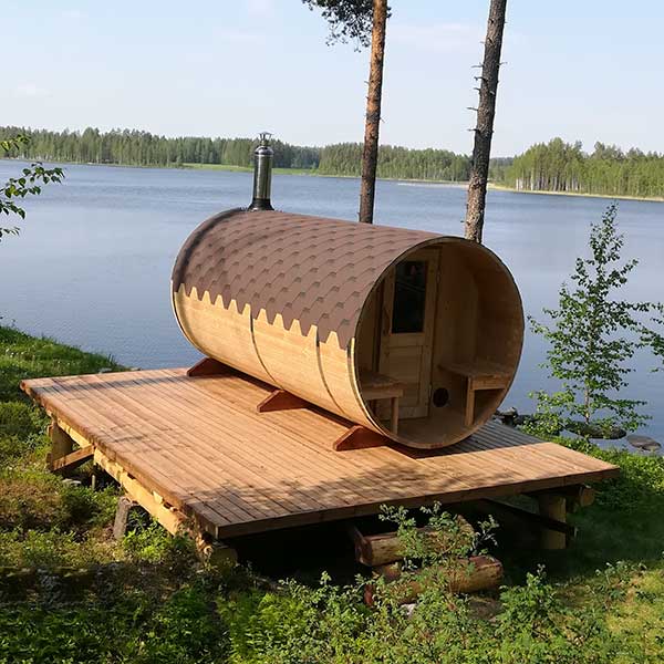 Die Fass-Sauna ist für 4-6 Personen geeignet. Sie verfügt über einen Vorraum und eine kleine überdachte Sitzmöglichkeit im Außenbereich für 2 Personen. Dieses Modell ist sehr komfortabel. Im Vorraum haben Sie sowohl die Möglichkeit, sich auch bei kalten und nassen Witterungsbedingungen umzukleiden, als auch gemütlich zu entspannen. Der kleine überdachte Außenbereich lädt ein, sich draußen in freier Natur zu entspannen. Die Fass-Sauna kann mit einem Holzofen oder mit einem Elektroofen ausgestattet werden. Die Sauna kann ohne Fundament aufgestellt werden und ist in der Regel ein baugenehmigungsfreies Vorhaben, welches aber im Einzelfall zu prüfen ist.