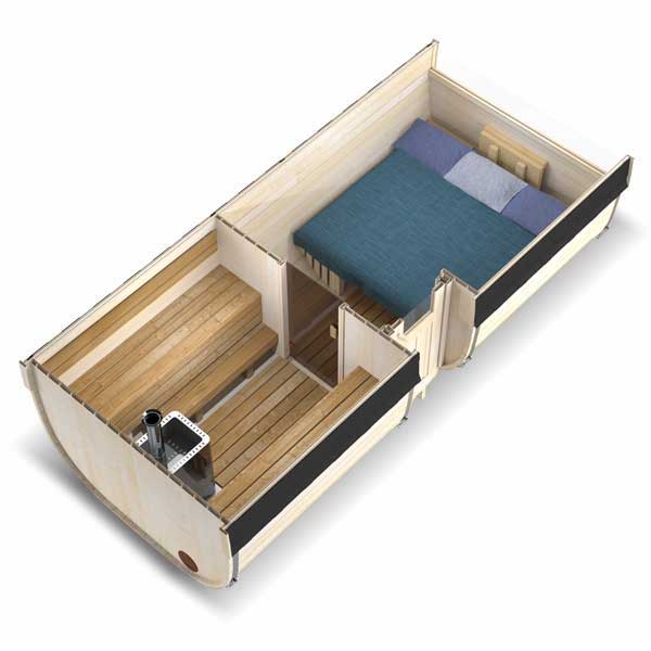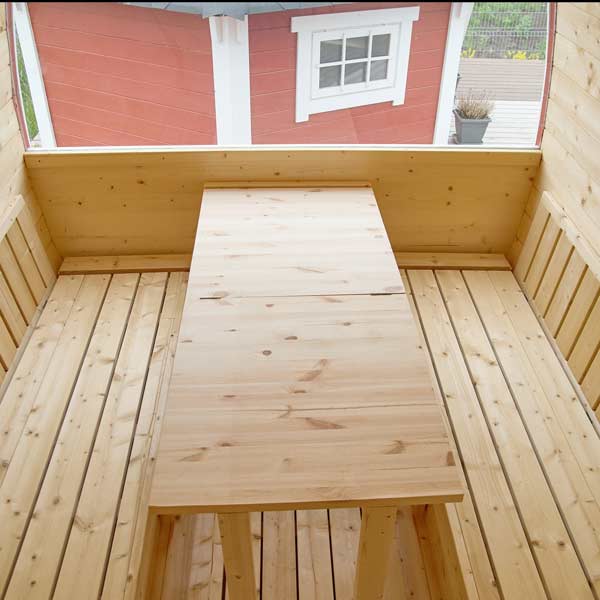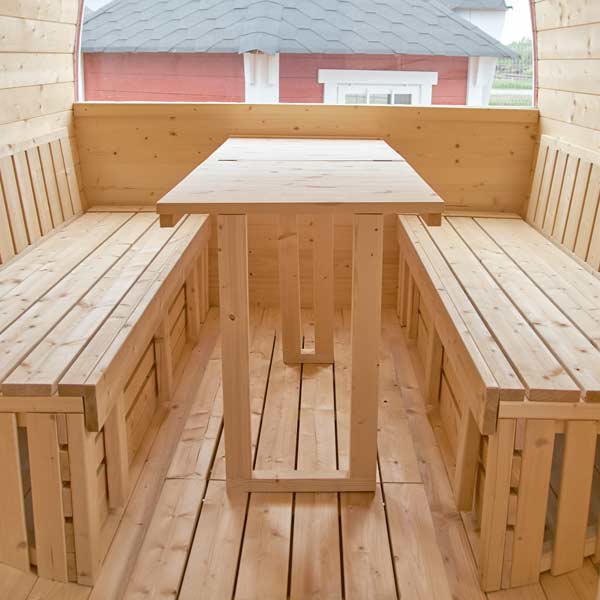 Die Fasssauna mit Vorraum ist ein 2-in-1-Modell, bei dem die Sitze und der Tisch leicht in eine ca. 2,1 x 1,8 m große Liegefläche umgewandelt werden können. Dies kann eine großartige Lösung für diejenigen sein, die viel Zeit mit Freunden und Familie in der Natur verbringen.